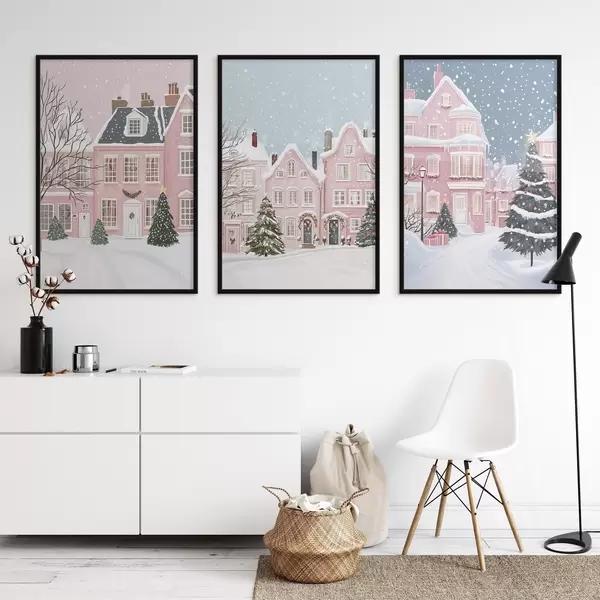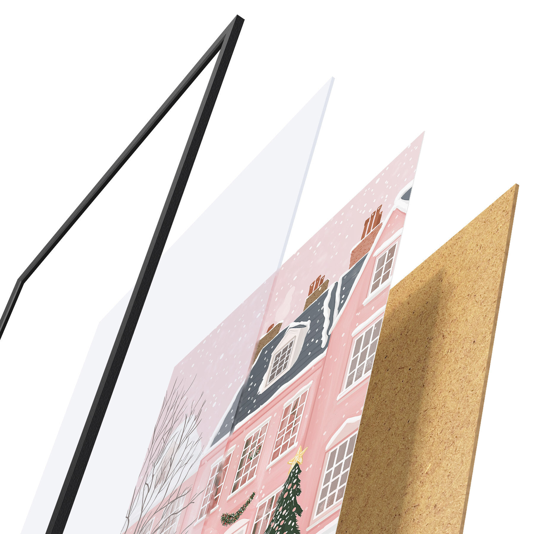 Poster Schöne Winterstadt mit rosa Häusern, Kiefern, Schneeflocken d00410