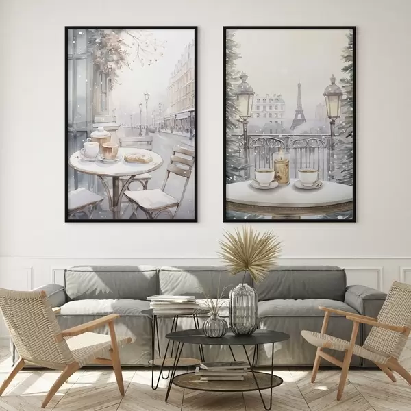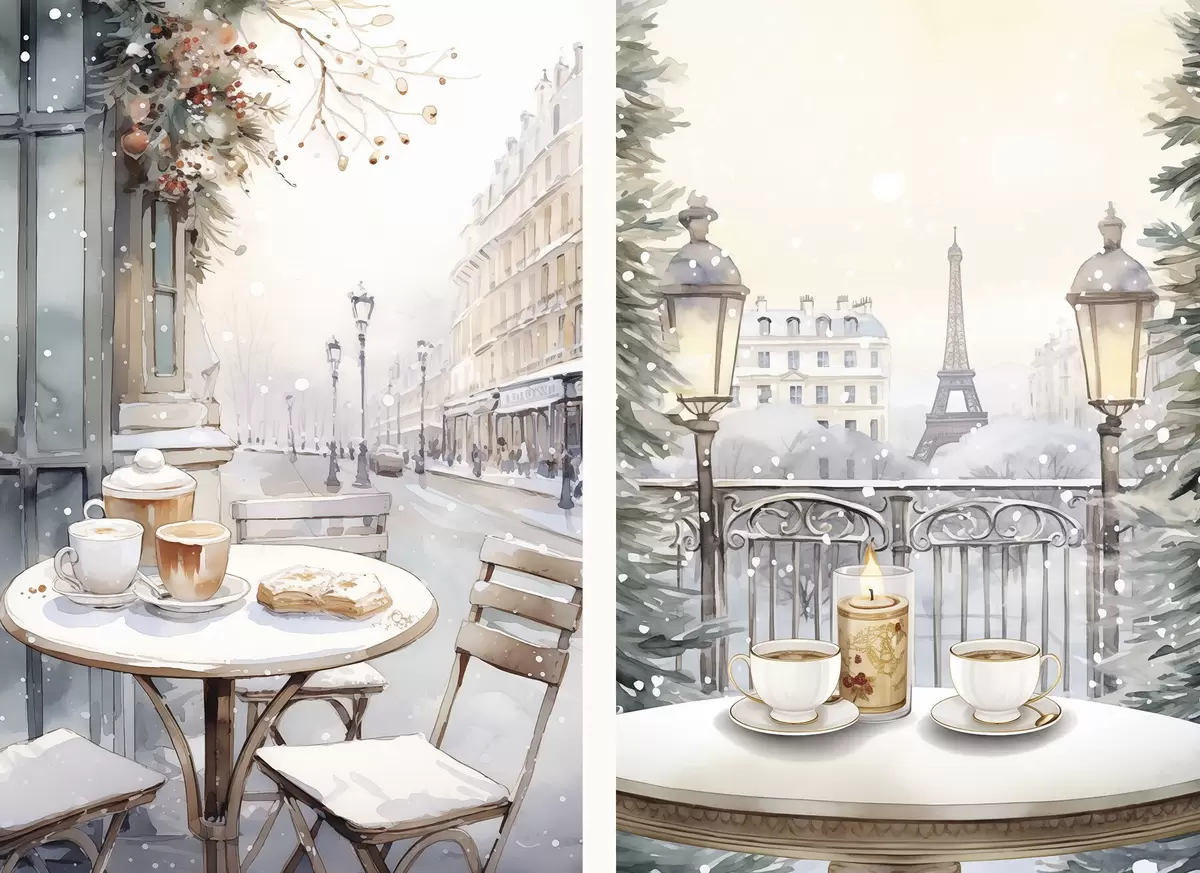 Poster Ästhetische Cafés mit Tassen Kaffee, Paris Stadt Straße, Winter, Architektur Nr d00413