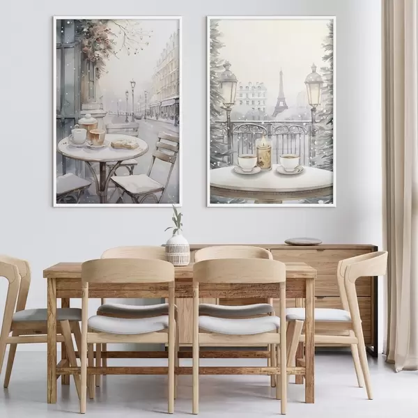 Poster Ästhetische Cafés mit Tassen Kaffee, Paris Stadt Straße, Winter, Architektur d00413