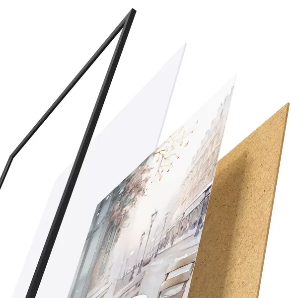 Das Poster besteht aus einem Rahmen, Plexiglas, einem gedruckten Bild und einer Rückwand aus Spanplatten. Dank der Halterungen auf der Rückseite kann das Poster sofort an die Wand gehängt werden.