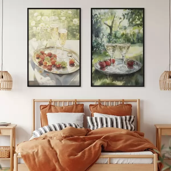 Poster Sommerpicknick, Sektgläser mit Erdbeeren auf dem Tablett, Kamillenblüten Nr d00414