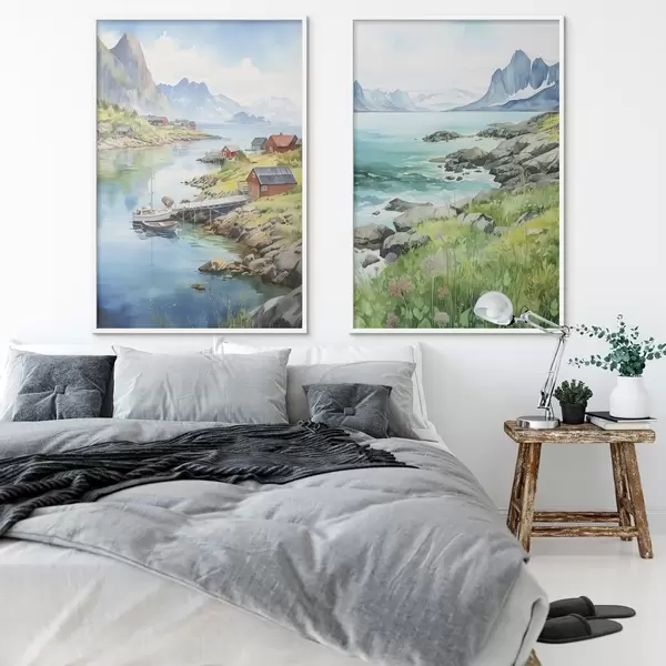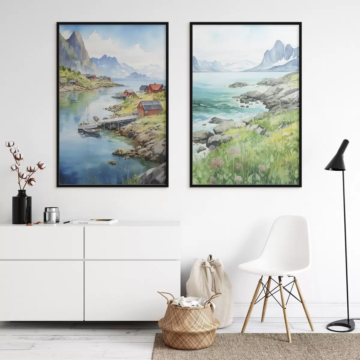 Poster Norwegen Natur, Lofoten Inseln, Sommerlandschaft, rote Häuser, Berge, Boote Nr d00421