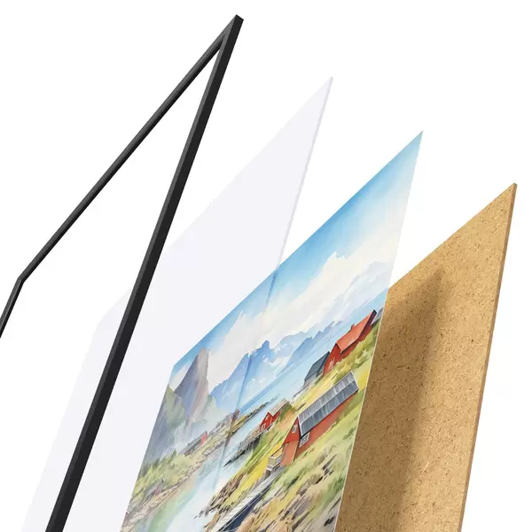 Das Poster besteht aus einem Rahmen, Plexiglas, einem gedruckten Bild und einer Rückwand aus Spanplatten. Dank der Halterungen auf der Rückseite kann das Poster sofort an die Wand gehängt werden.