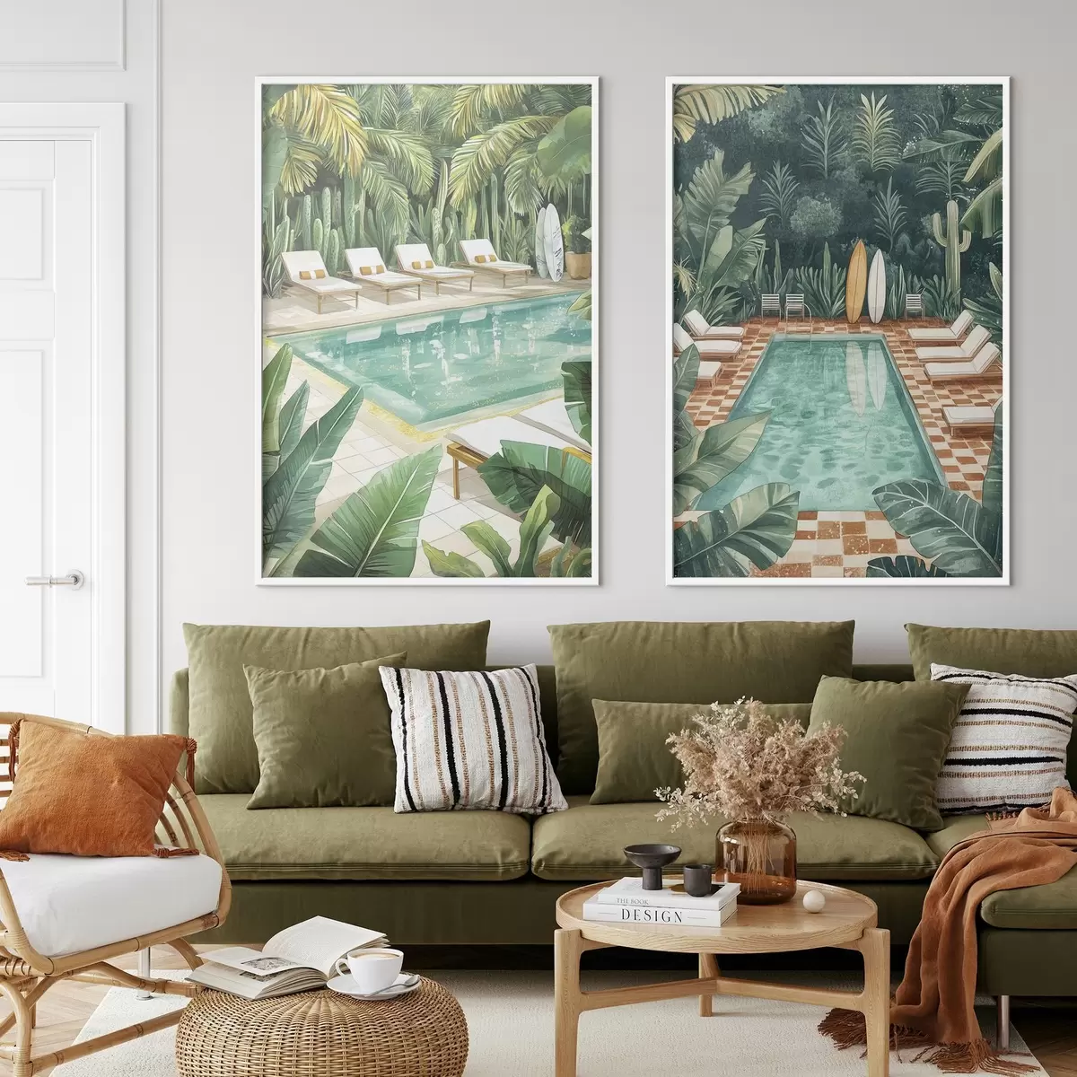 Poster Sommerpool, Vintage, Tropenwald, Grünzeug, Palmen, Aquarellstil d00422