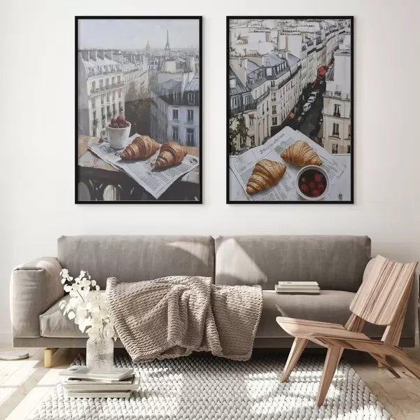 Poster Stadtansicht auf einem Balkon in Paris, Eiffelturm, Erdbeeren, Kaffee, Tagebuch d00445