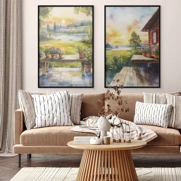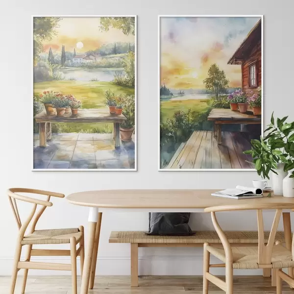 Poster Sommerdorf, Sonnenuntergang, rustikal, Blumen, See, Aquarell-Stil d00449