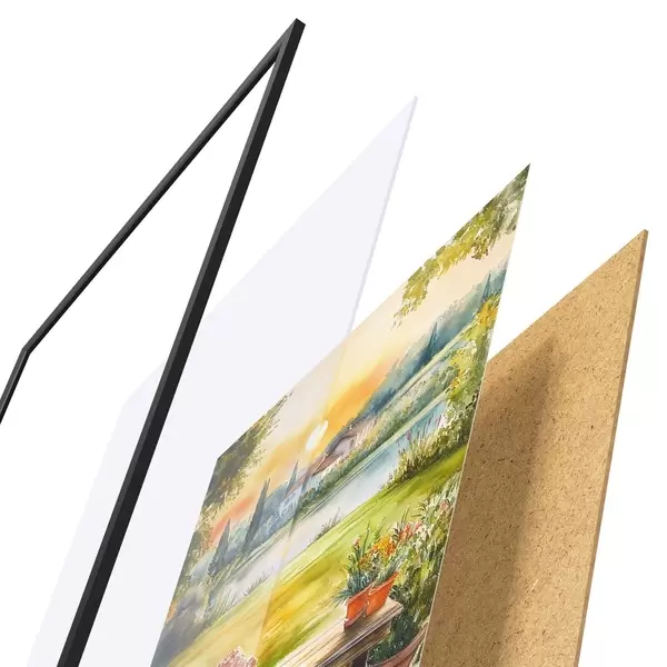 Das Poster besteht aus einem Rahmen, Plexiglas, einem gedruckten Bild und einer Rückwand aus Spanplatten. Dank der Halterungen auf der Rückseite kann das Poster sofort an die Wand gehängt werden.