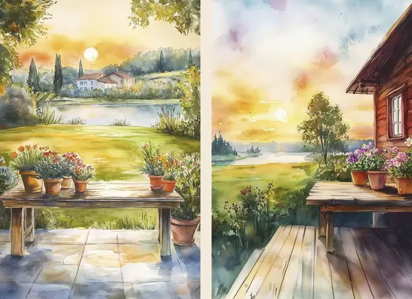 Poster Sommerdorf, Sonnenuntergang, rustikal, Blumen, See, Aquarell-Stil d00449