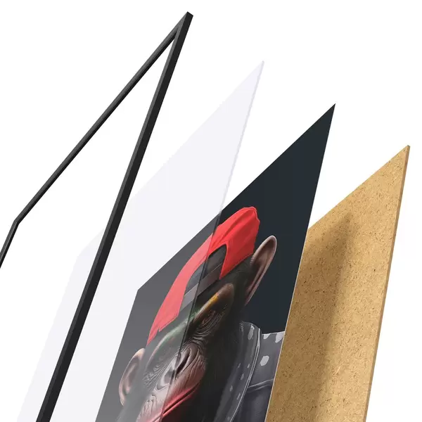 Das Poster besteht aus einem Rahmen, Plexiglas, einem gedruckten Bild und einer Rückwand aus Spanplatten. Dank der Halterungen auf der Rückseite kann das Poster sofort an die Wand gehängt werden.