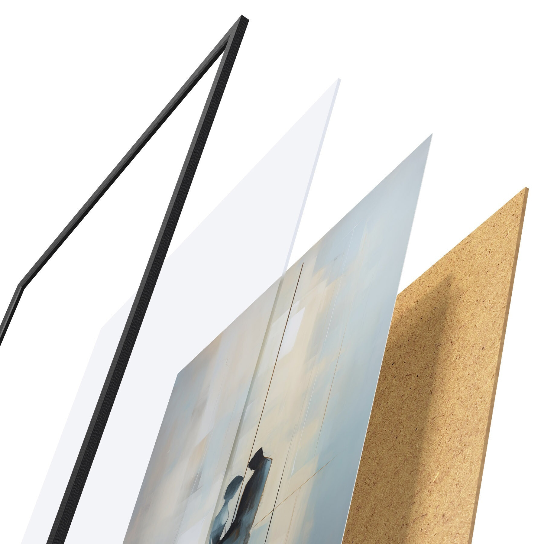 Das Poster besteht aus einem Rahmen, Plexiglas, einem gedruckten Bild und einer Rückwand aus Spanplatten. Dank der Halterungen auf der Rückseite kann das Poster sofort an die Wand gehängt werden.