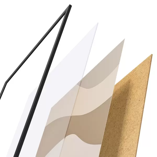 Das Poster besteht aus einem Rahmen, Plexiglas, einem gedruckten Bild und einer Rückwand aus Spanplatten. Dank der Halterungen auf der Rückseite kann das Poster sofort an die Wand gehängt werden.