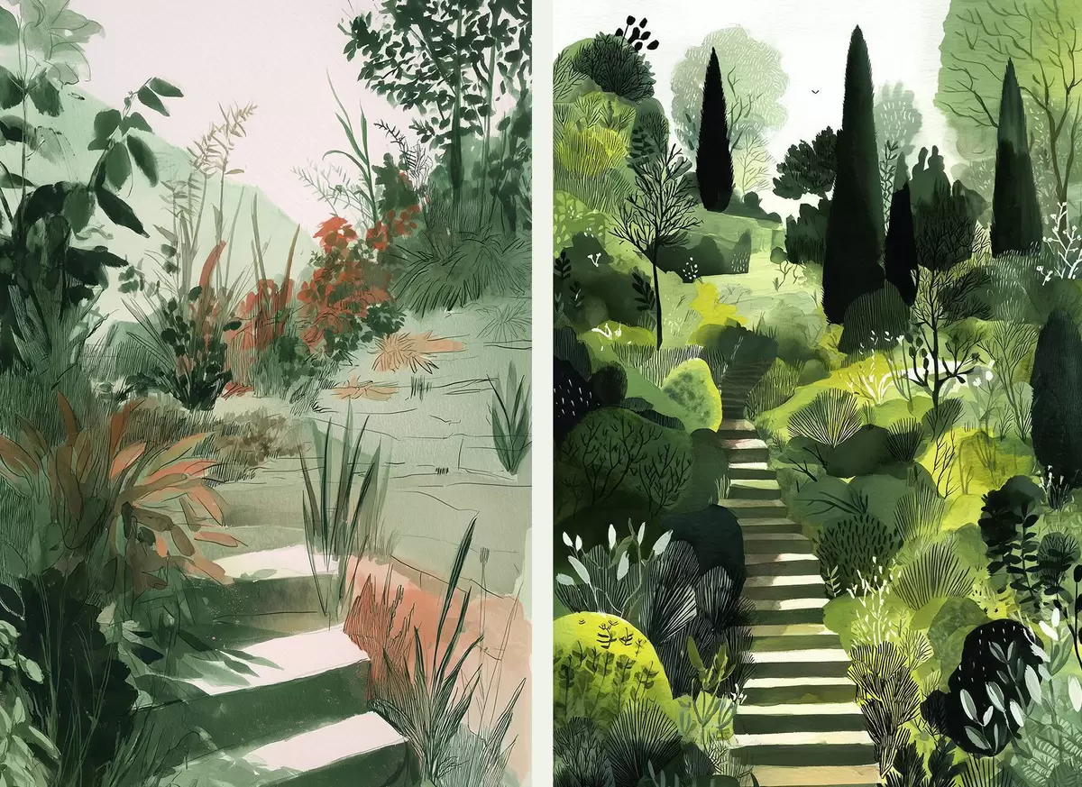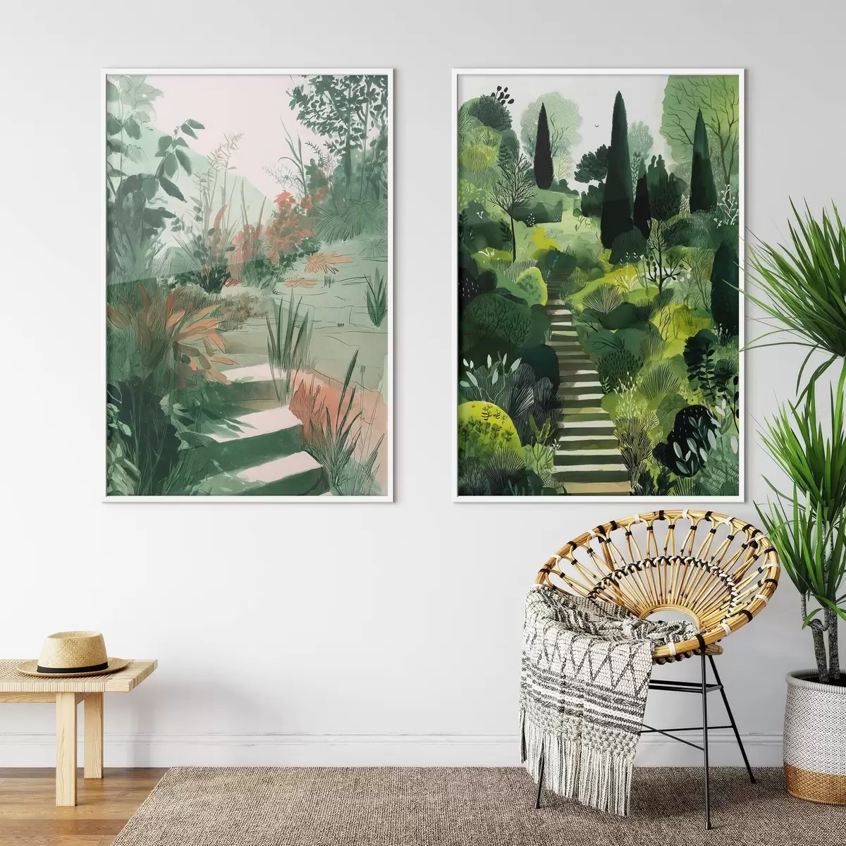 Poster Grüner orientalischer Garten mit Büschen und Bäumen Nr d00478
