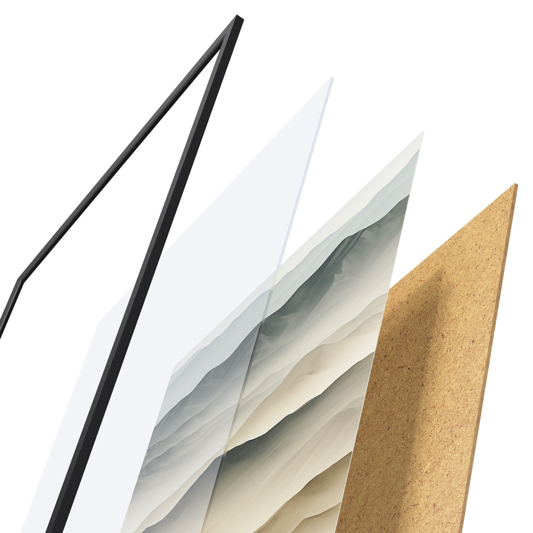 Das Poster besteht aus einem Rahmen, Plexiglas, einem gedruckten Bild und einer Rückwand aus Spanplatten. Dank der Halterungen auf der Rückseite kann das Poster sofort an die Wand gehängt werden.