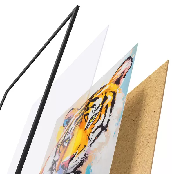 Das Poster besteht aus einem Rahmen, Plexiglas, einem gedruckten Bild und einer Rückwand aus Spanplatten. Dank der Halterungen auf der Rückseite kann das Poster sofort an die Wand gehängt werden.