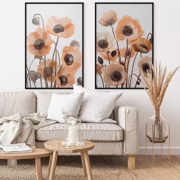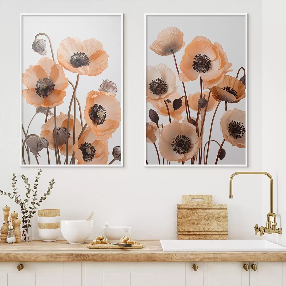 Poster Orangefarbene Mohnblumen, getrocknete Blumen vor einem hellen Hintergrund, weiche Beleuchtung, zarte Blütenblätter, Blumenarrangement Nr d00518