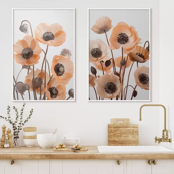 Poster Orangefarbene Mohnblumen, getrocknete Blumen vor einem hellen Hintergrund, weiche Beleuchtung, zarte Blütenblätter, Blumenarrangement d00518