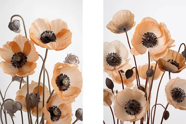 Poster Orangefarbene Mohnblumen, getrocknete Blumen vor einem hellen Hintergrund, weiche Beleuchtung, zarte Blütenblätter, Blumenarrangement d00518