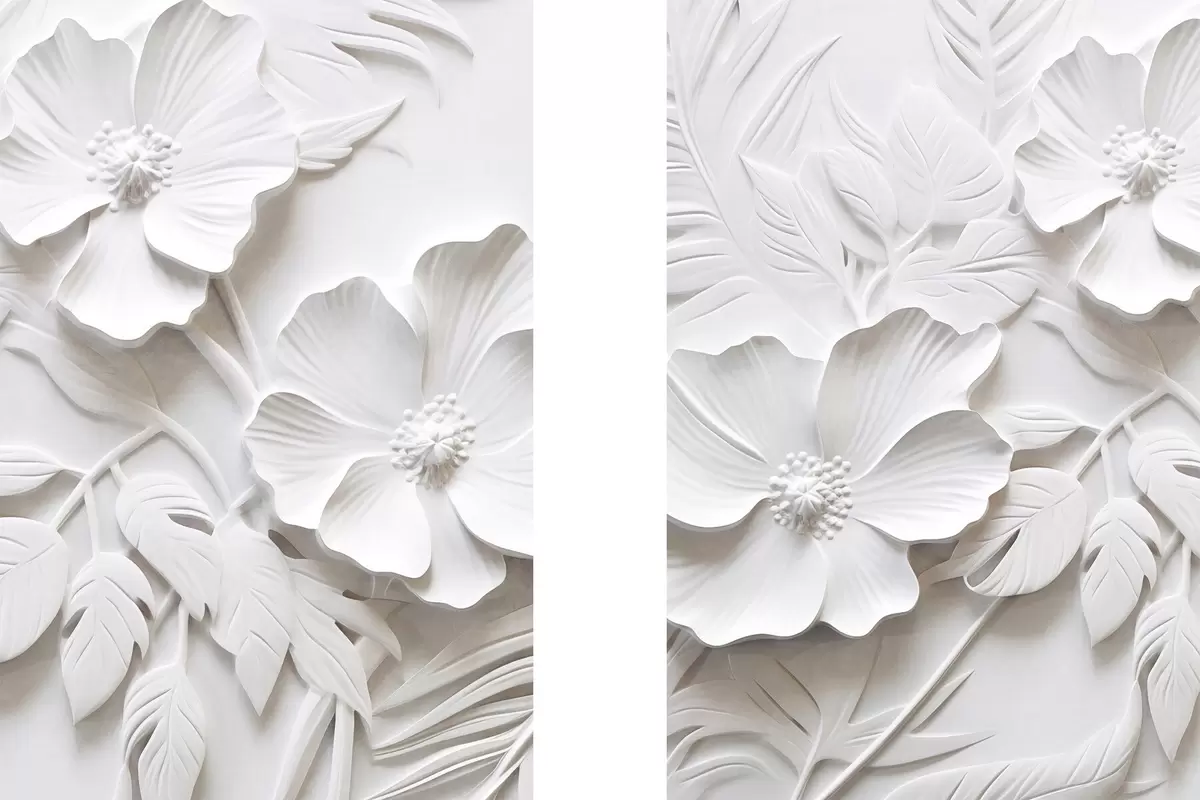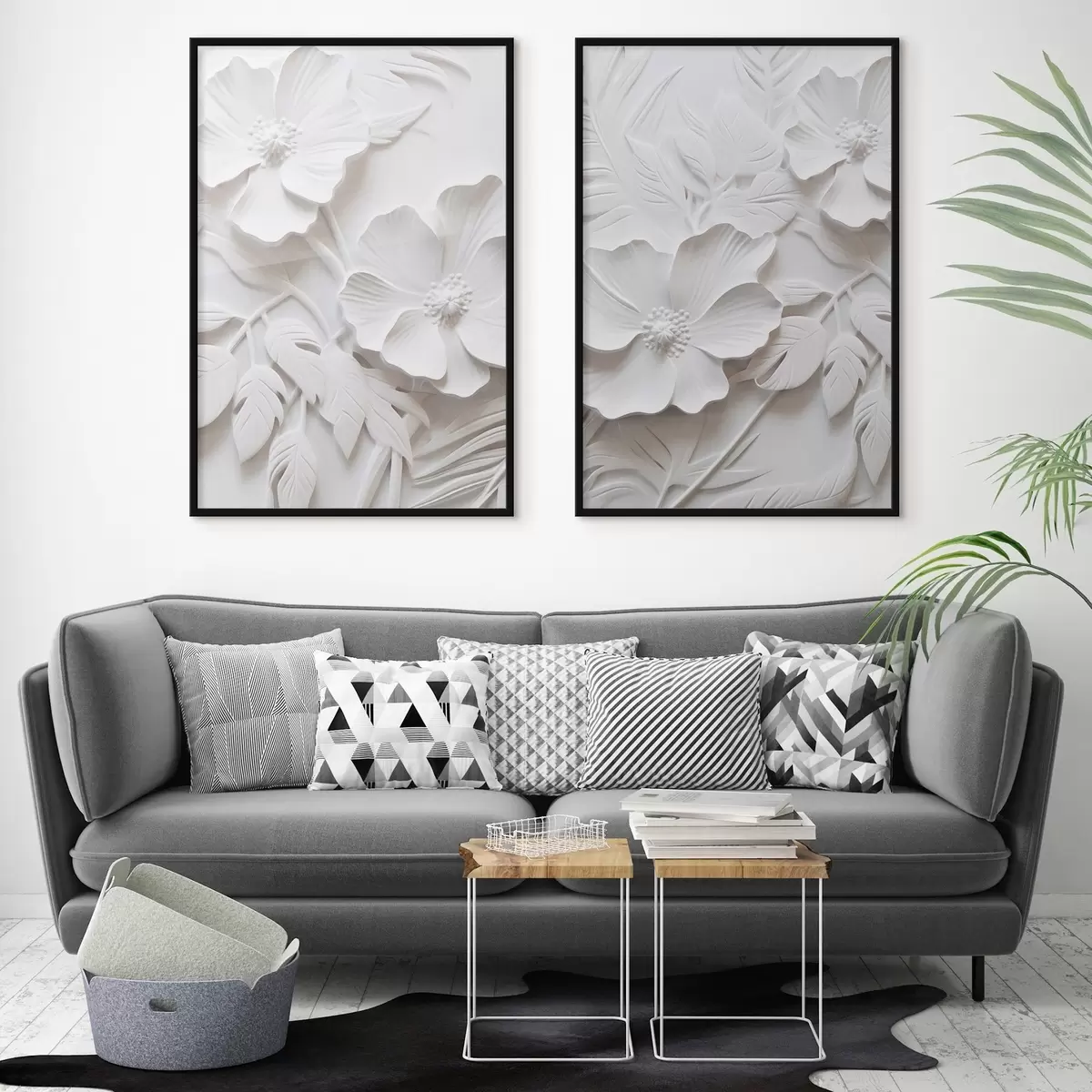 Poster Dekorative minimalistische weiße Blumen mit Blättern, Relief-Imitation, weißer Hintergrund d00524