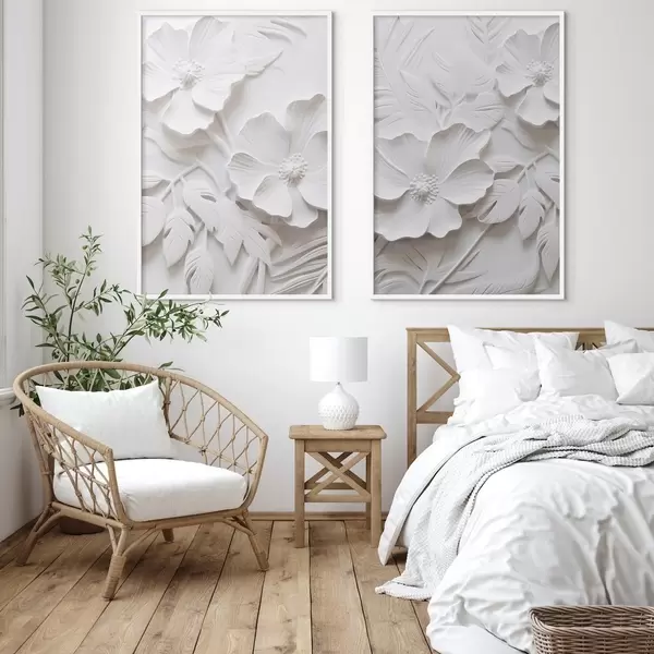 Poster Dekorative minimalistische weiße Blumen mit Blättern, Relief-Imitation, weißer Hintergrund Nr d00524