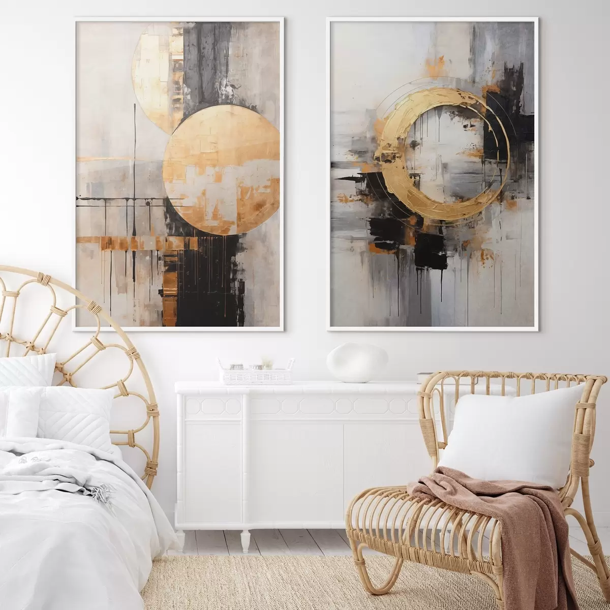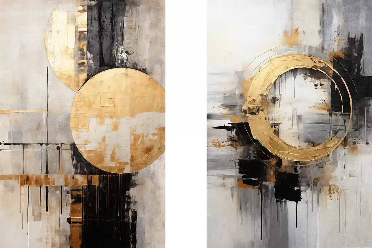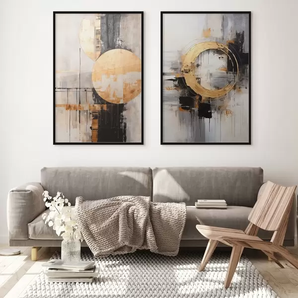Poster Abstrakte Malerei mit Kreisen, schwarzen und gelben Linien und einem Hintergrund mit grauen und weißen Tönen Nr d00527