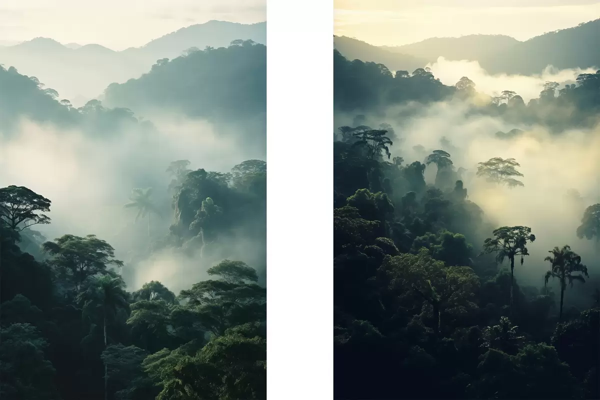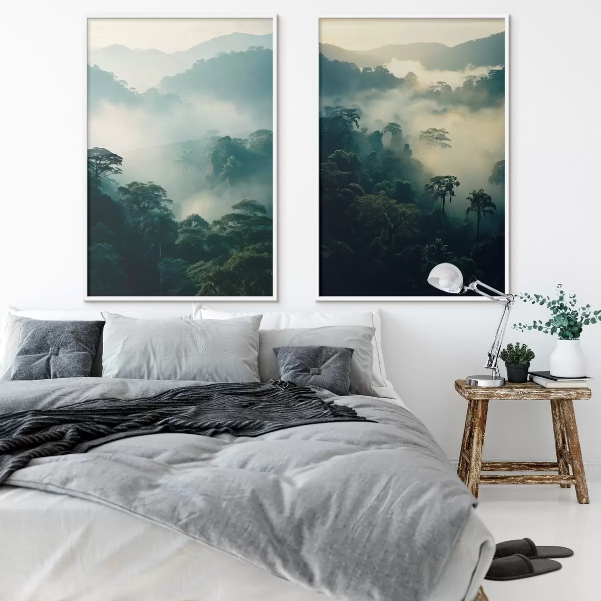 Poster Tropischer Regenwald mit üppig grünen Bäumen und einer dicken Nebelschicht, die eine stimmungsvolle Umgebung schafft d00529