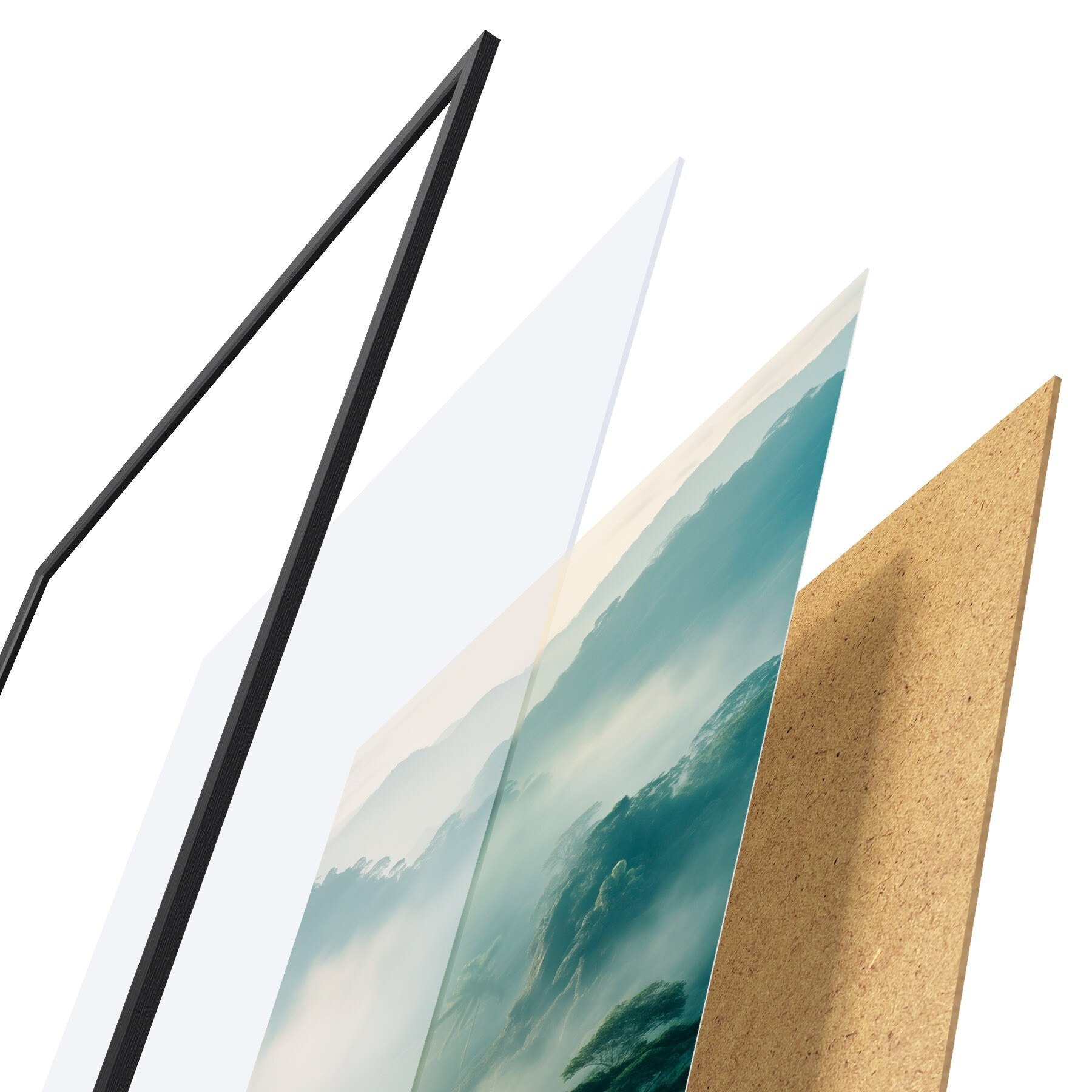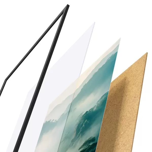 Das Poster besteht aus einem Rahmen, Plexiglas, einem gedruckten Bild und einer Rückwand aus Spanplatten. Dank der Halterungen auf der Rückseite kann das Poster sofort an die Wand gehängt werden.