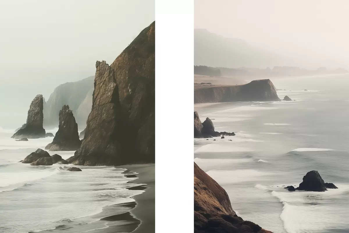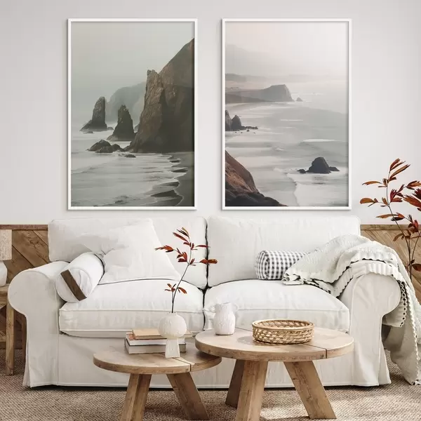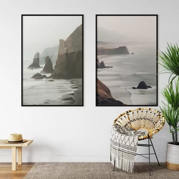 Poster Felsige Klippen und Meeresküste, Wellen, die an das Ufer schlagen, Landschaft mit stimmungsvoller Atmosphäre, erdige Töne d00531