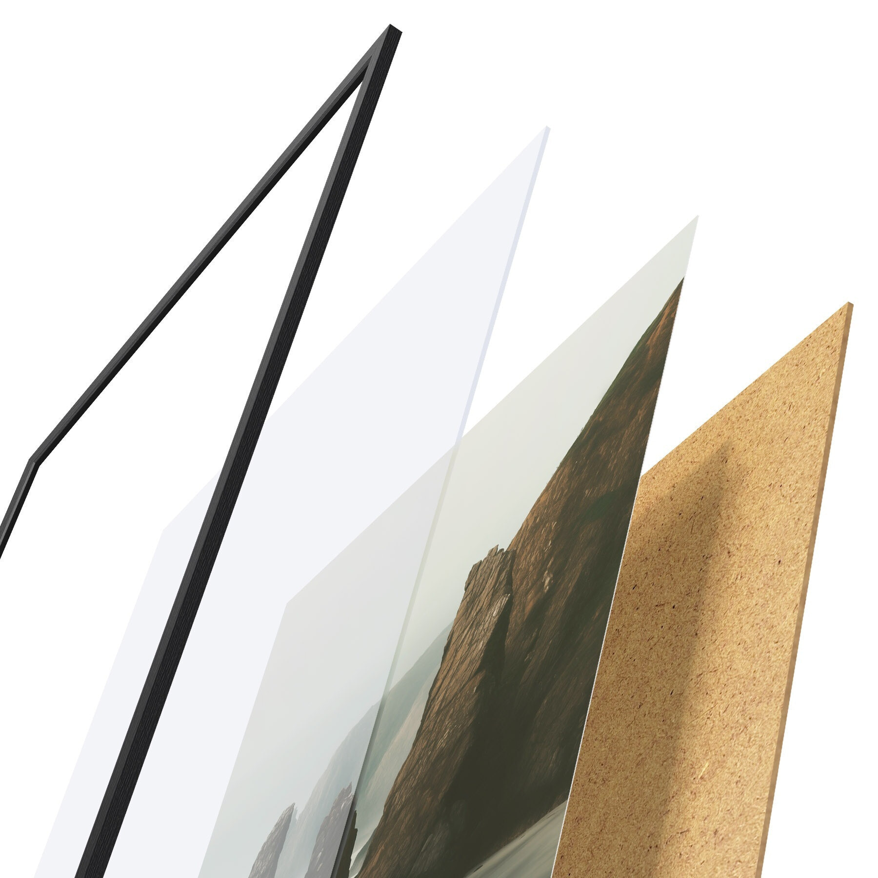 Das Poster besteht aus einem Rahmen, Plexiglas, einem gedruckten Bild und einer Rückwand aus Spanplatten. Dank der Halterungen auf der Rückseite kann das Poster sofort an die Wand gehängt werden.