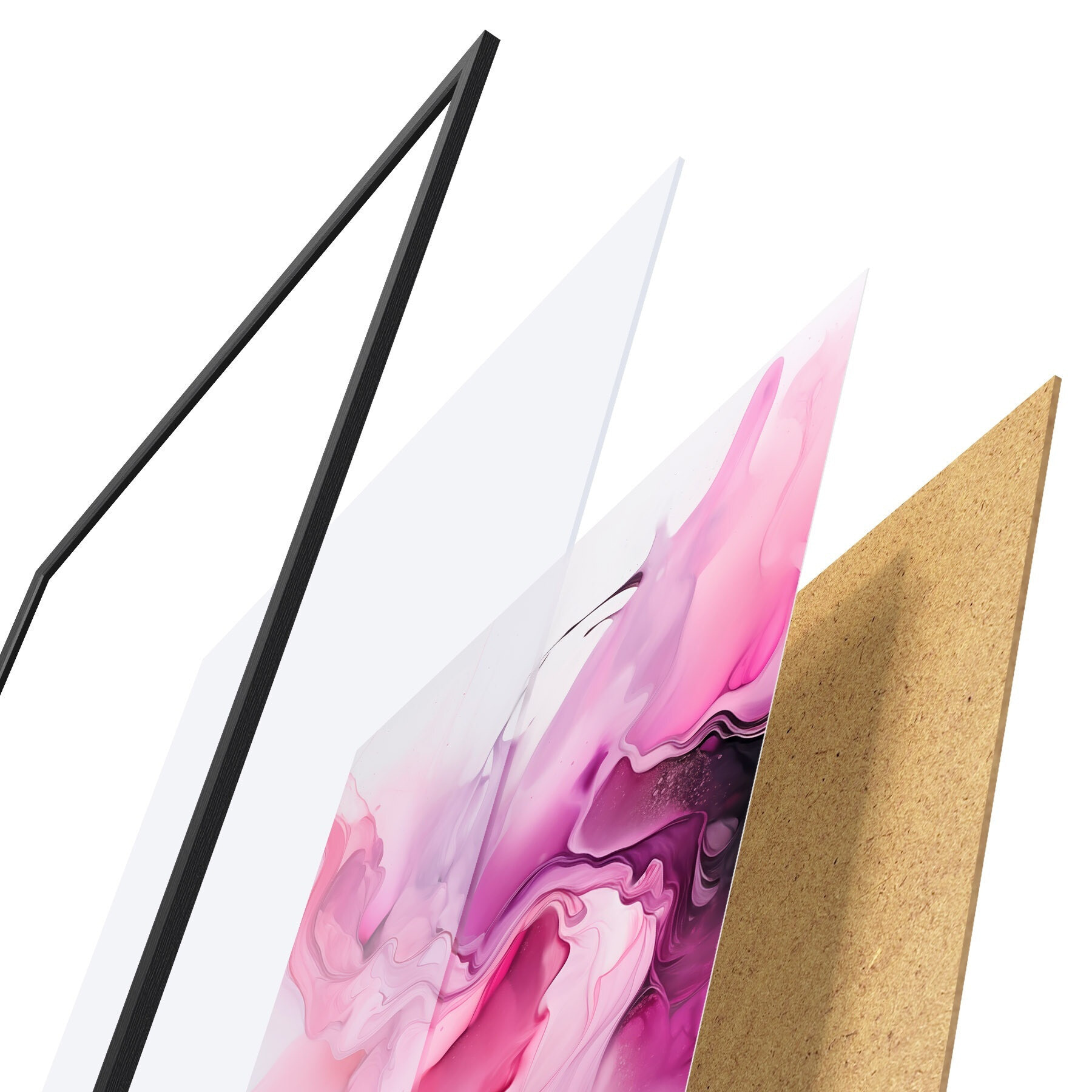 Das Poster besteht aus einem Rahmen, Plexiglas, einem gedruckten Bild und einer Rückwand aus Spanplatten. Dank der Halterungen auf der Rückseite kann das Poster sofort an die Wand gehängt werden.