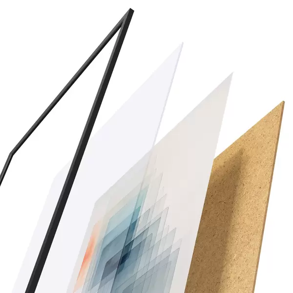 Das Poster besteht aus einem Rahmen, Plexiglas, einem gedruckten Bild und einer Rückwand aus Spanplatten. Dank der Halterungen auf der Rückseite kann das Poster sofort an die Wand gehängt werden.