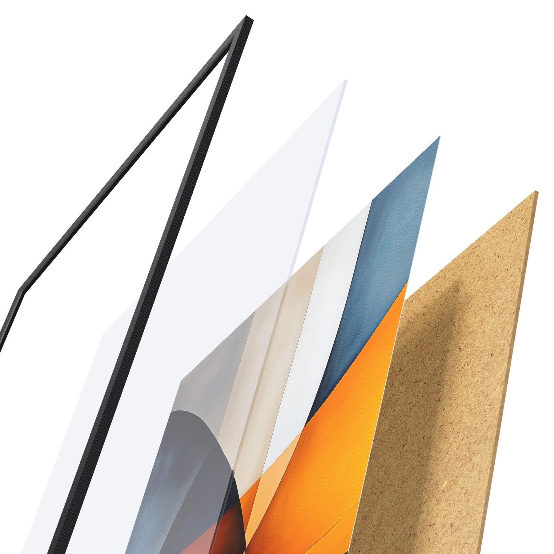 Das Poster besteht aus einem Rahmen, Plexiglas, einem gedruckten Bild und einer Rückwand aus Spanplatten. Dank der Halterungen auf der Rückseite kann das Poster sofort an die Wand gehängt werden.