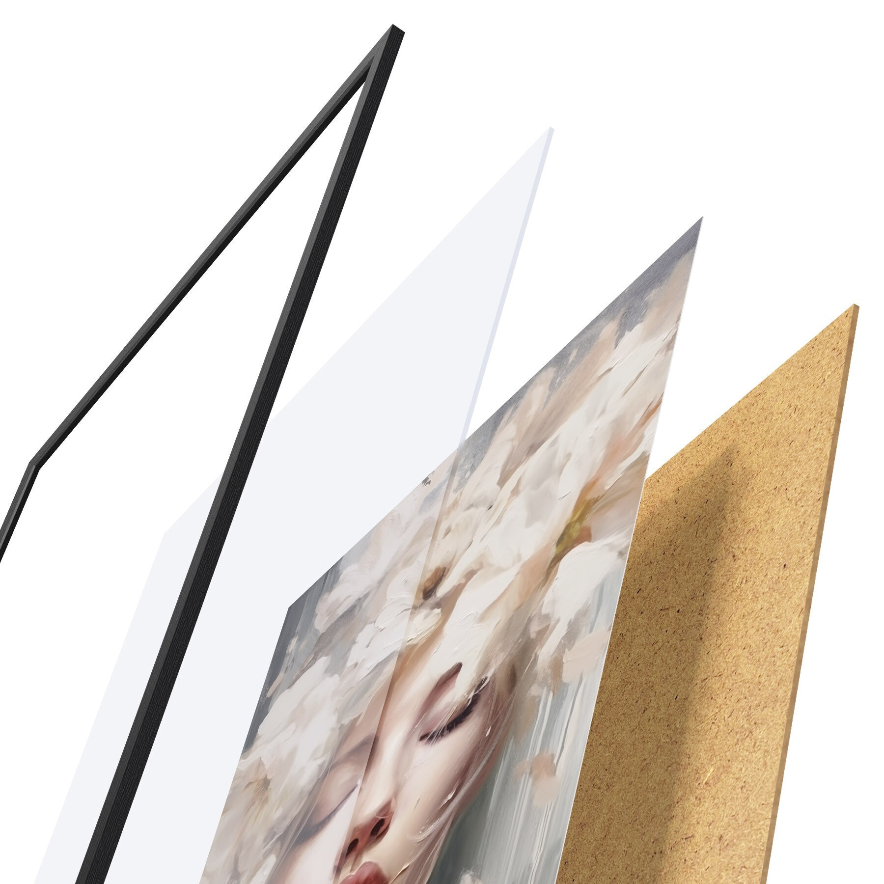 Das Poster besteht aus einem Rahmen, Plexiglas, einem gedruckten Bild und einer Rückwand aus Spanplatten. Dank der Halterungen auf der Rückseite kann das Poster sofort an die Wand gehängt werden.