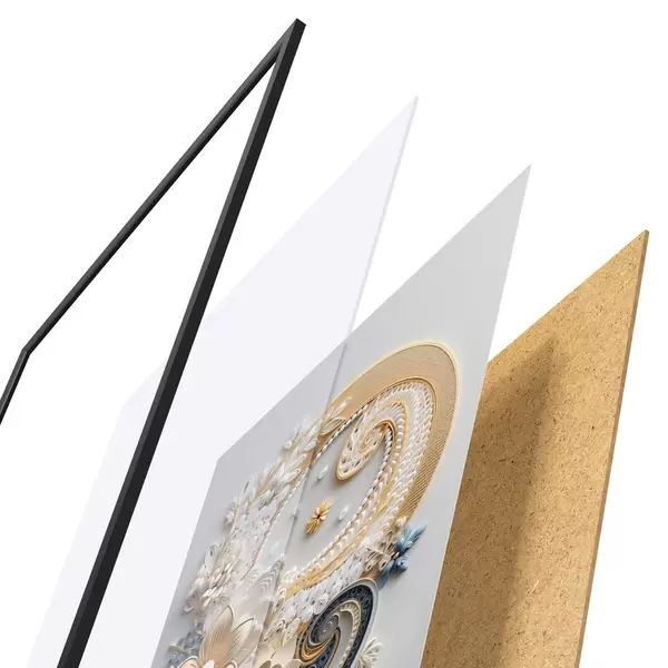 Das Poster besteht aus einem Rahmen, Plexiglas, einem gedruckten Bild und einer Rückwand aus Spanplatten. Dank der Halterungen auf der Rückseite kann das Poster sofort an die Wand gehängt werden.