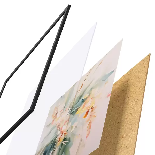 Das Poster besteht aus einem Rahmen, Plexiglas, einem gedruckten Bild und einer Rückwand aus Spanplatten. Dank der Halterungen auf der Rückseite kann das Poster sofort an die Wand gehängt werden.