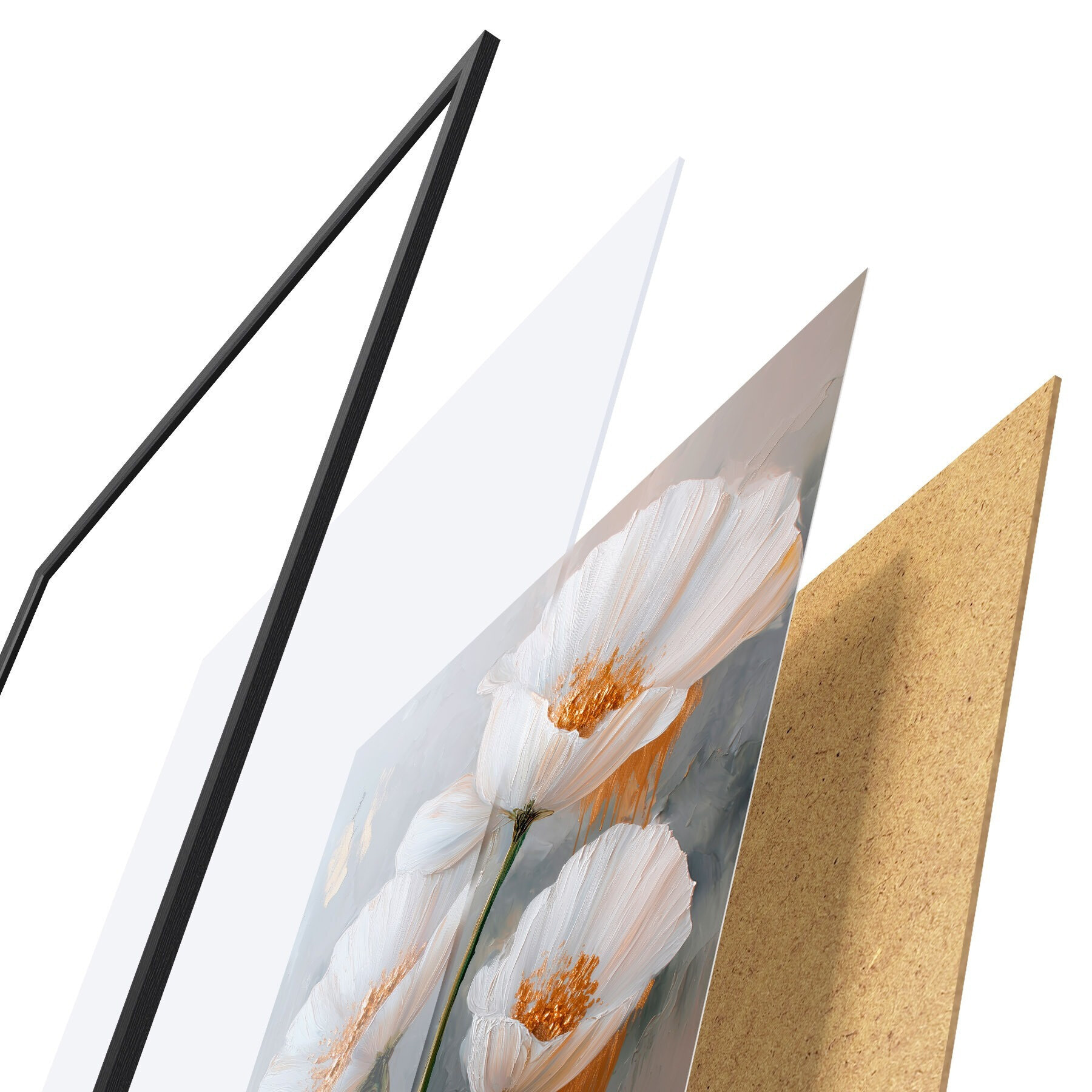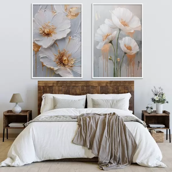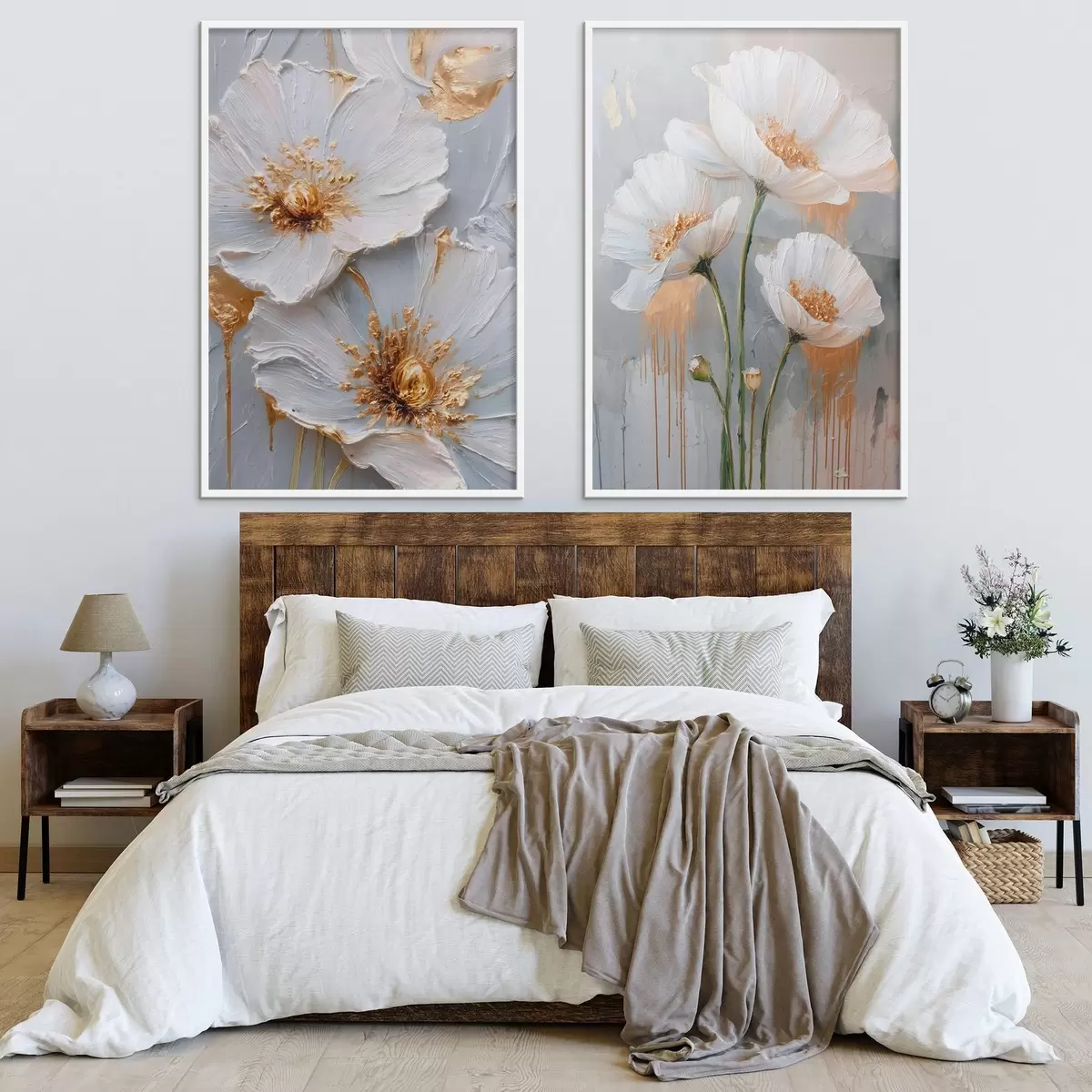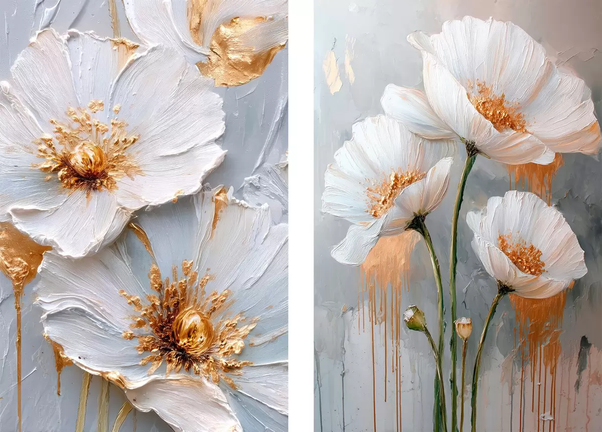 Poster Volumetrische Malerei von weißen Blumen mit goldenen Akzenten auf grauem Hintergrund Nr d00568