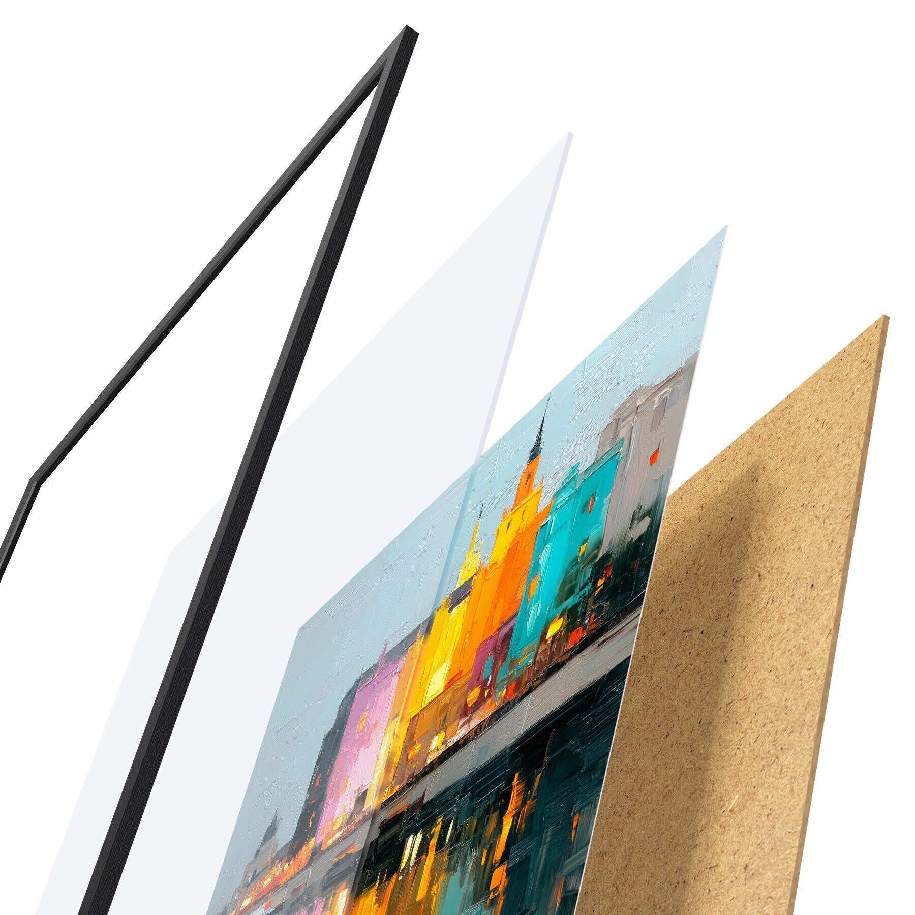 Das Poster besteht aus einem Rahmen, Plexiglas, einem gedruckten Bild und einer Rückwand aus Spanplatten. Dank der Halterungen auf der Rückseite kann das Poster sofort an die Wand gehängt werden.