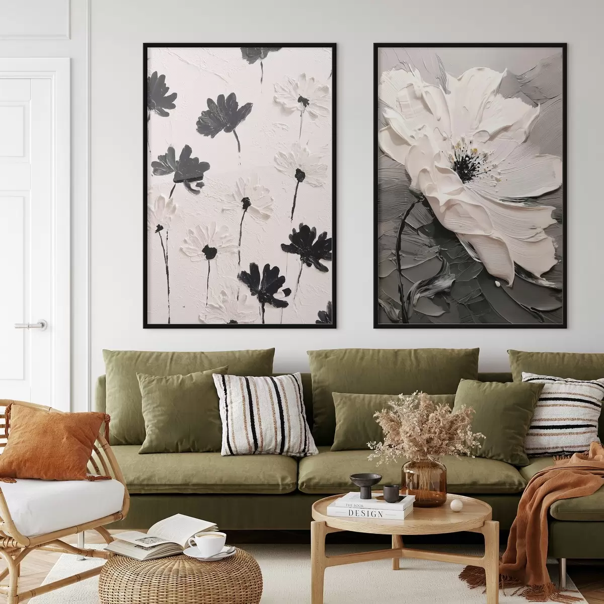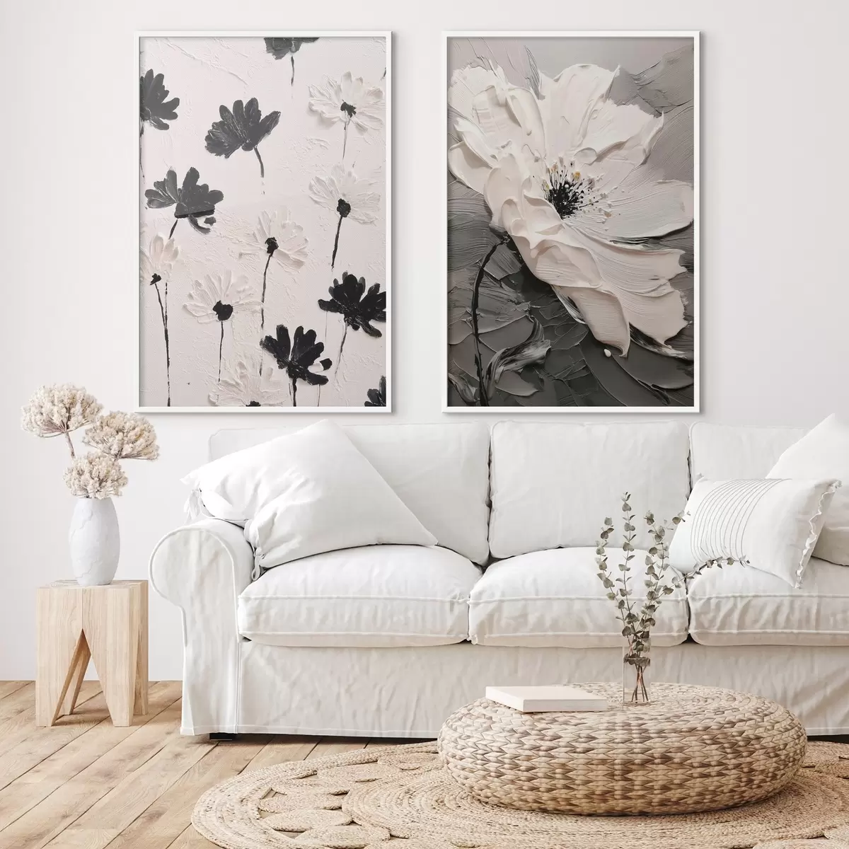 Poster Diptychon mit weißen und schwarzen Blumen in einem modernen Stil d00571