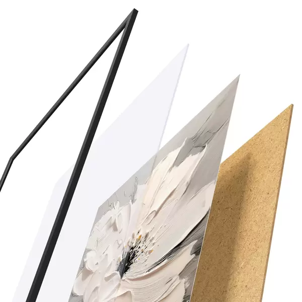 Das Poster besteht aus einem Rahmen, Plexiglas, einem gedruckten Bild und einer Rückwand aus Spanplatten. Dank der Halterungen auf der Rückseite kann das Poster sofort an die Wand gehängt werden.