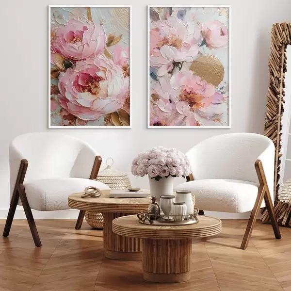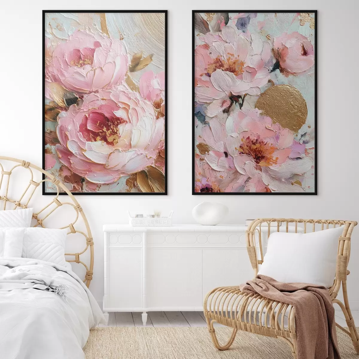 Poster Volumetrische Impasto-Malerei mit rosa Pfingstrosen und strukturierten Details d00573