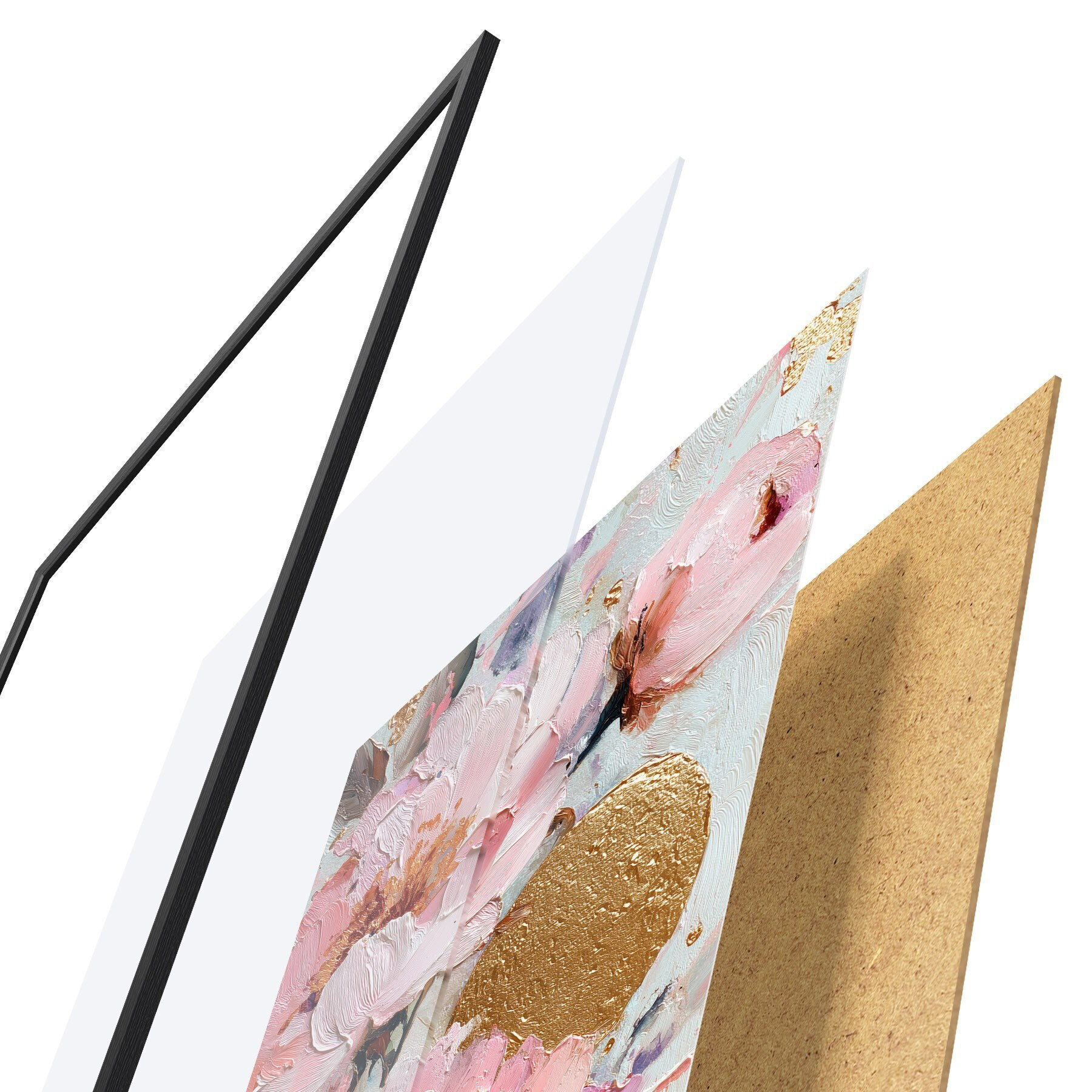 Das Poster besteht aus einem Rahmen, Plexiglas, einem gedruckten Bild und einer Rückwand aus Spanplatten. Dank der Halterungen auf der Rückseite kann das Poster sofort an die Wand gehängt werden.