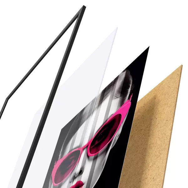 Das Poster besteht aus einem Rahmen, Plexiglas, einem gedruckten Bild und einer Rückwand aus Spanplatten. Dank der Halterungen auf der Rückseite kann das Poster sofort an die Wand gehängt werden.