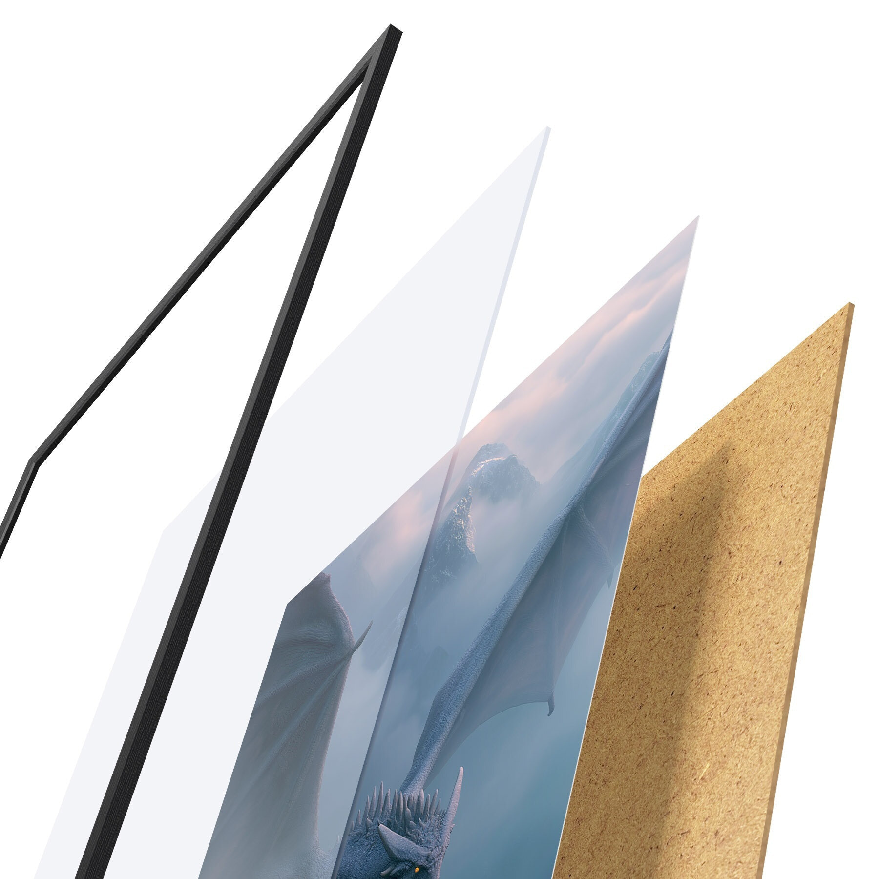 Das Poster besteht aus einem Rahmen, Plexiglas, einem gedruckten Bild und einer Rückwand aus Spanplatten. Dank der Halterungen auf der Rückseite kann das Poster sofort an die Wand gehängt werden.