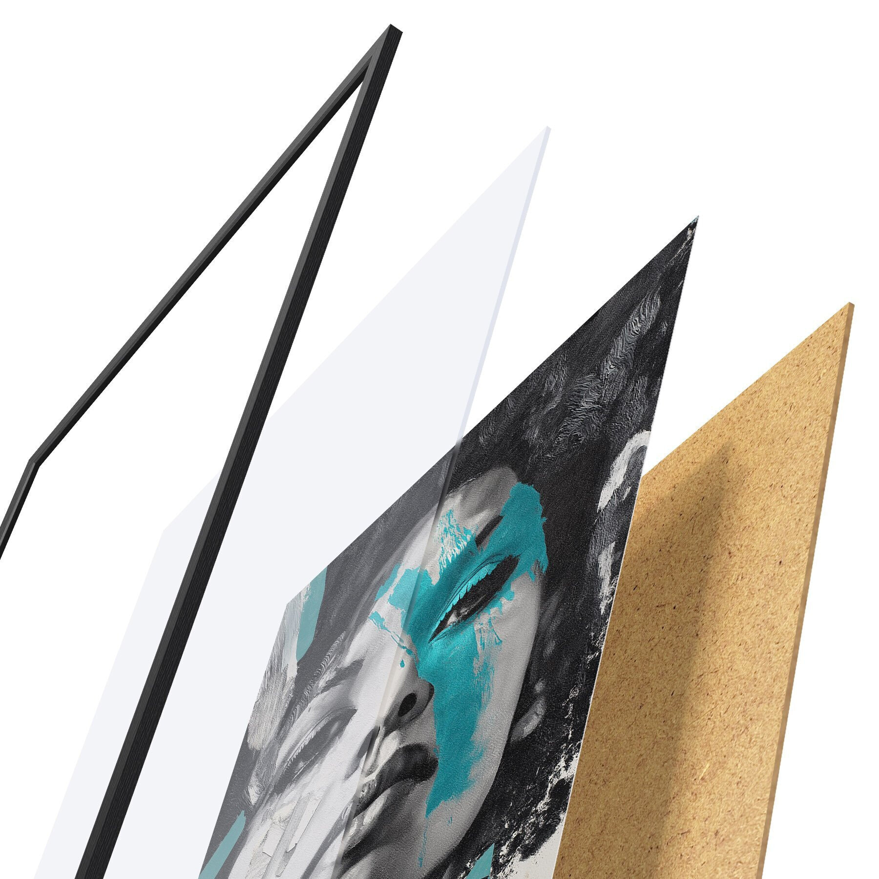 Das Poster besteht aus einem Rahmen, Plexiglas, einem gedruckten Bild und einer Rückwand aus Spanplatten. Dank der Halterungen auf der Rückseite kann das Poster sofort an die Wand gehängt werden.