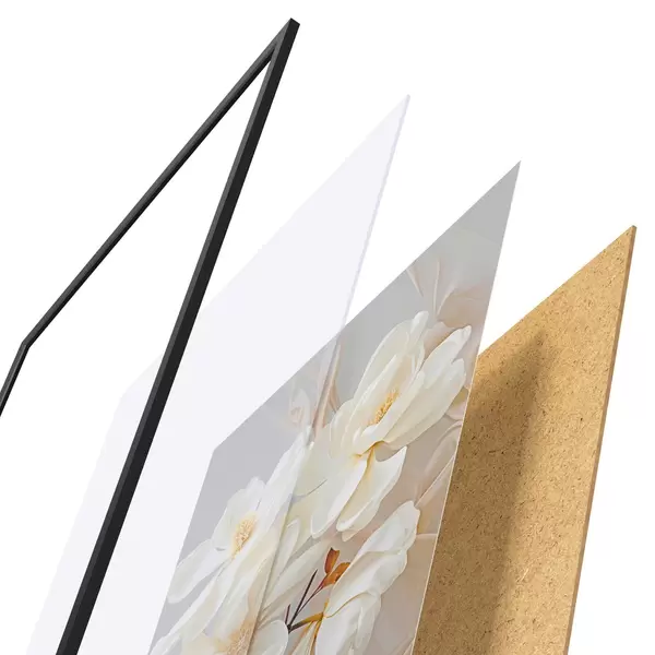 Das Poster besteht aus einem Rahmen, Plexiglas, einem gedruckten Bild und einer Rückwand aus Spanplatten. Dank der Halterungen auf der Rückseite kann das Poster sofort an die Wand gehängt werden.