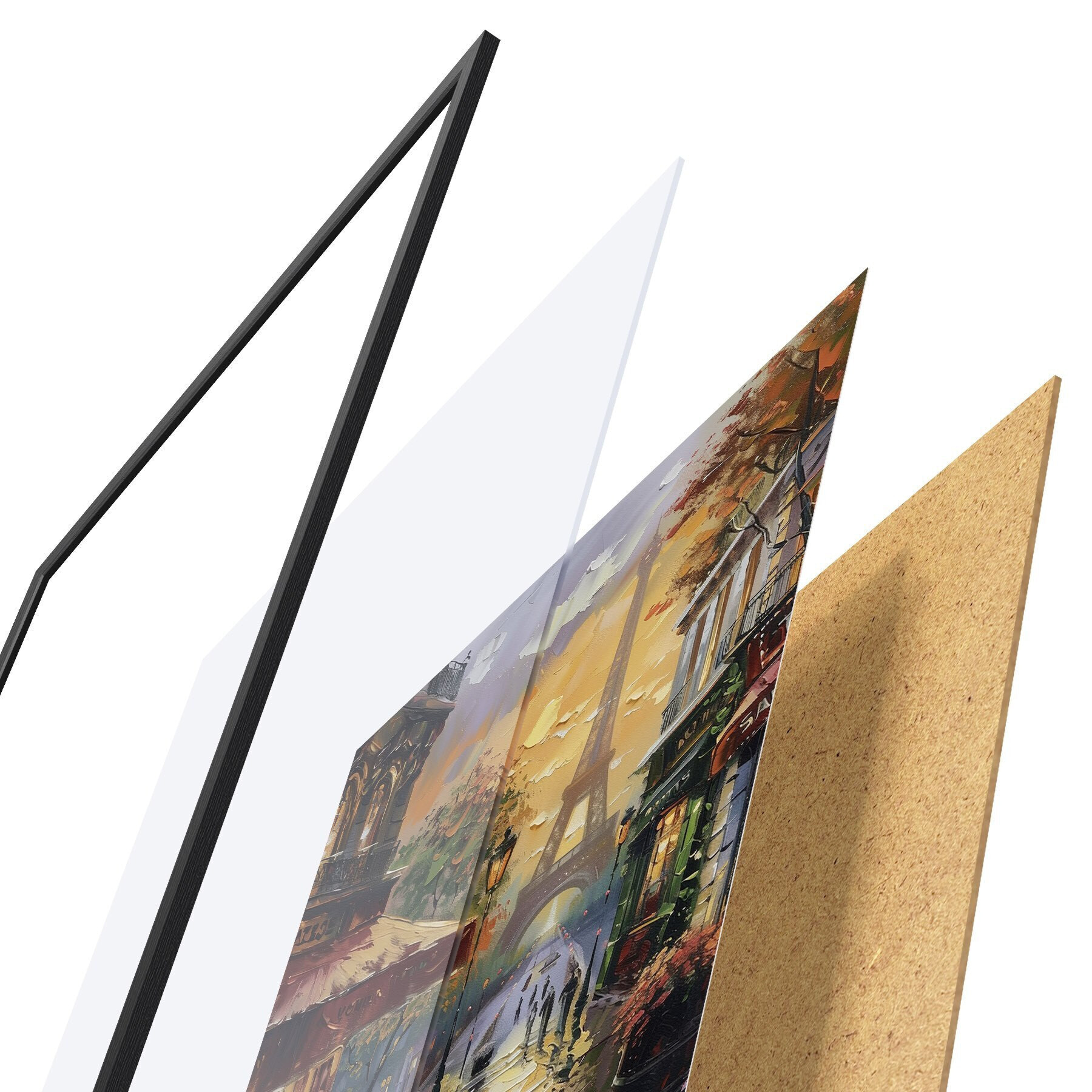 Das Poster besteht aus einem Rahmen, Plexiglas, einem gedruckten Bild und einer Rückwand aus Spanplatten. Dank der Halterungen auf der Rückseite kann das Poster sofort an die Wand gehängt werden.