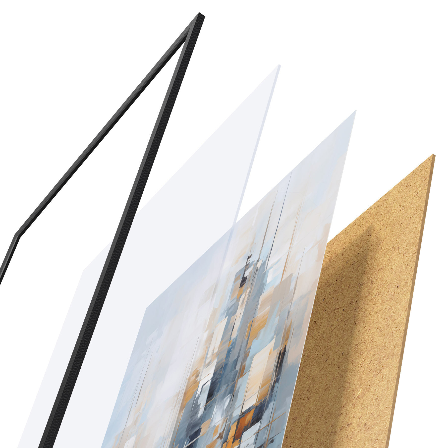 Das Poster besteht aus einem Rahmen, Plexiglas, einem gedruckten Bild und einer Rückwand aus Spanplatten. Dank der Halterungen auf der Rückseite kann das Poster sofort an die Wand gehängt werden.
