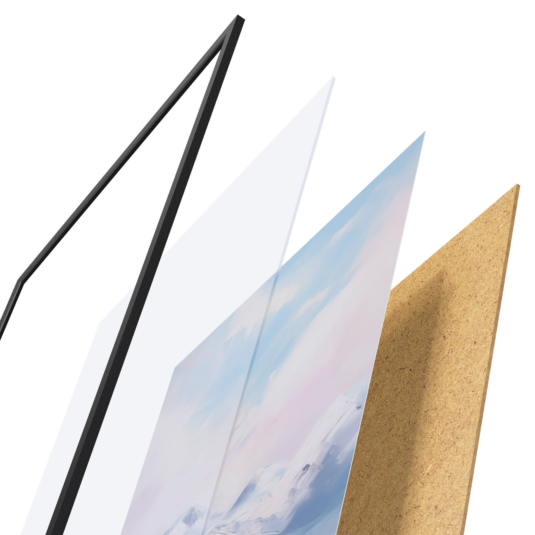 Das Poster besteht aus einem Rahmen, Plexiglas, einem gedruckten Bild und einer Rückwand aus Spanplatten. Dank der Halterungen auf der Rückseite kann das Poster sofort an die Wand gehängt werden.