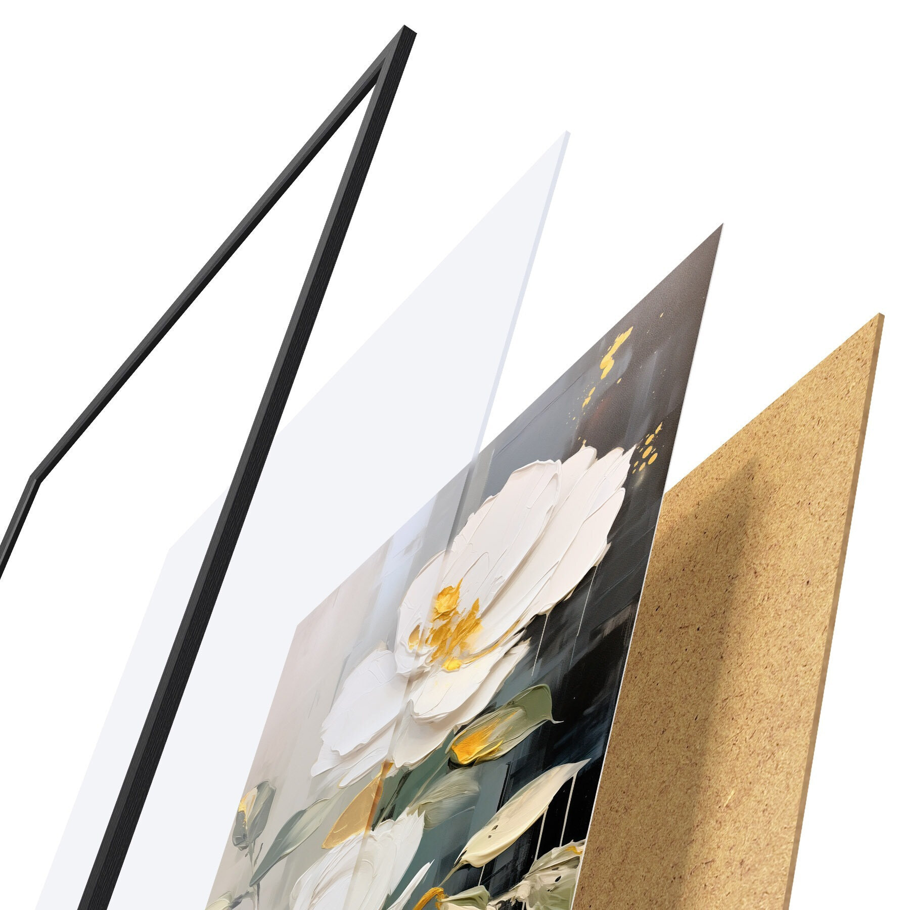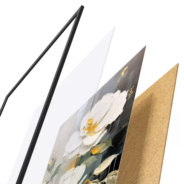Das Poster besteht aus einem Rahmen, Plexiglas, einem gedruckten Bild und einer Rückwand aus Spanplatten. Dank der Halterungen auf der Rückseite kann das Poster sofort an die Wand gehängt werden.