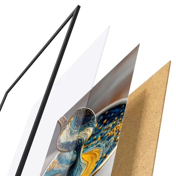 Das Poster besteht aus einem Rahmen, Plexiglas, einem gedruckten Bild und einer Rückwand aus Spanplatten. Dank der Halterungen auf der Rückseite kann das Poster sofort an die Wand gehängt werden.