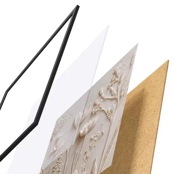 Das Poster besteht aus einem Rahmen, Plexiglas, einem gedruckten Bild und einer Rückwand aus Spanplatten. Dank der Halterungen auf der Rückseite kann das Poster sofort an die Wand gehängt werden.